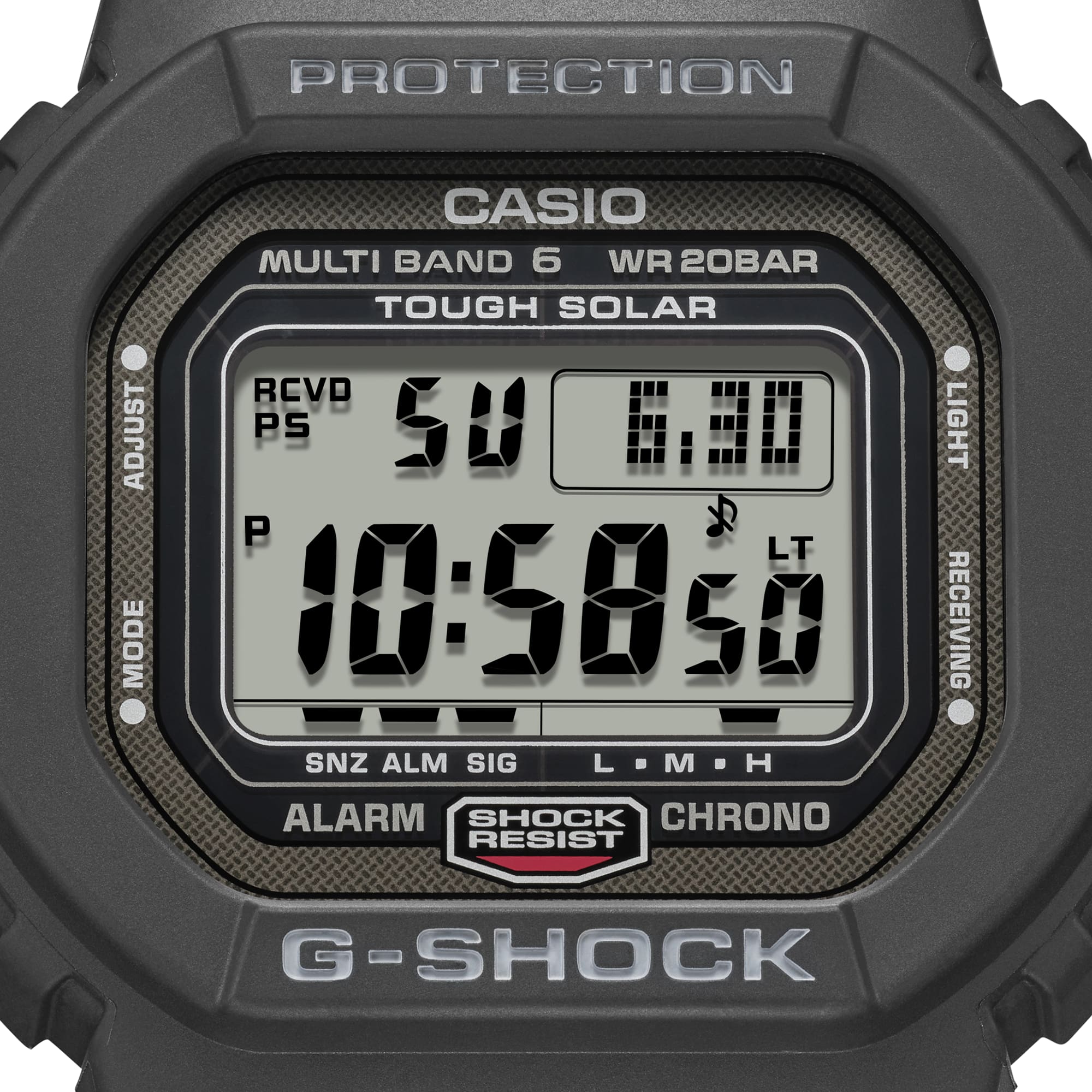 Pursuing further toughness while inheriting the DNA of the first G-SHOCK model (DW5000) the GW5000U-1 is constructed with a solid metal case and a screw back. This timepiece is also equipped with advanced technology, Multi-Band 6 that receives standard radio waves from 6 stations around the world. The metal case and screw back are made of DLC (diamond-like) to enhance wear resistance, and the screw back is also mirror-processed to create a luxurious finish. In addition, the resin band uses soft urethane that is comfortable to wear. Evolved from the G-SHOCK original design that was born in 1983, the GW5000U-1 is a discerning model that boasts technology and a high-quality finish.