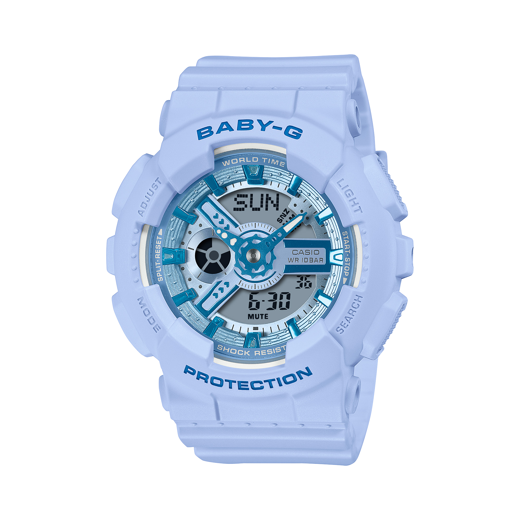 Wish you could travel back in time? This Y2K-inspired BABY-G is bursting with fresh color to bring the turn of the millennium to your active life today. We start with the popular BA-110, then dress it up with a dimensional dial to create a captivating watch face that highlights the complex interplay of various parts. The gear-inspired hour hand and bridge components feature a subtle heart motif. These singular details make this colorful Y2K-styled accessory really pop. Available in vibrant monochromatic color schemes inspired by vivid Y2K fashion. Not just cool, but practical, too. The watch is not only shock resistant, but is also water resistant up to 100 meters.