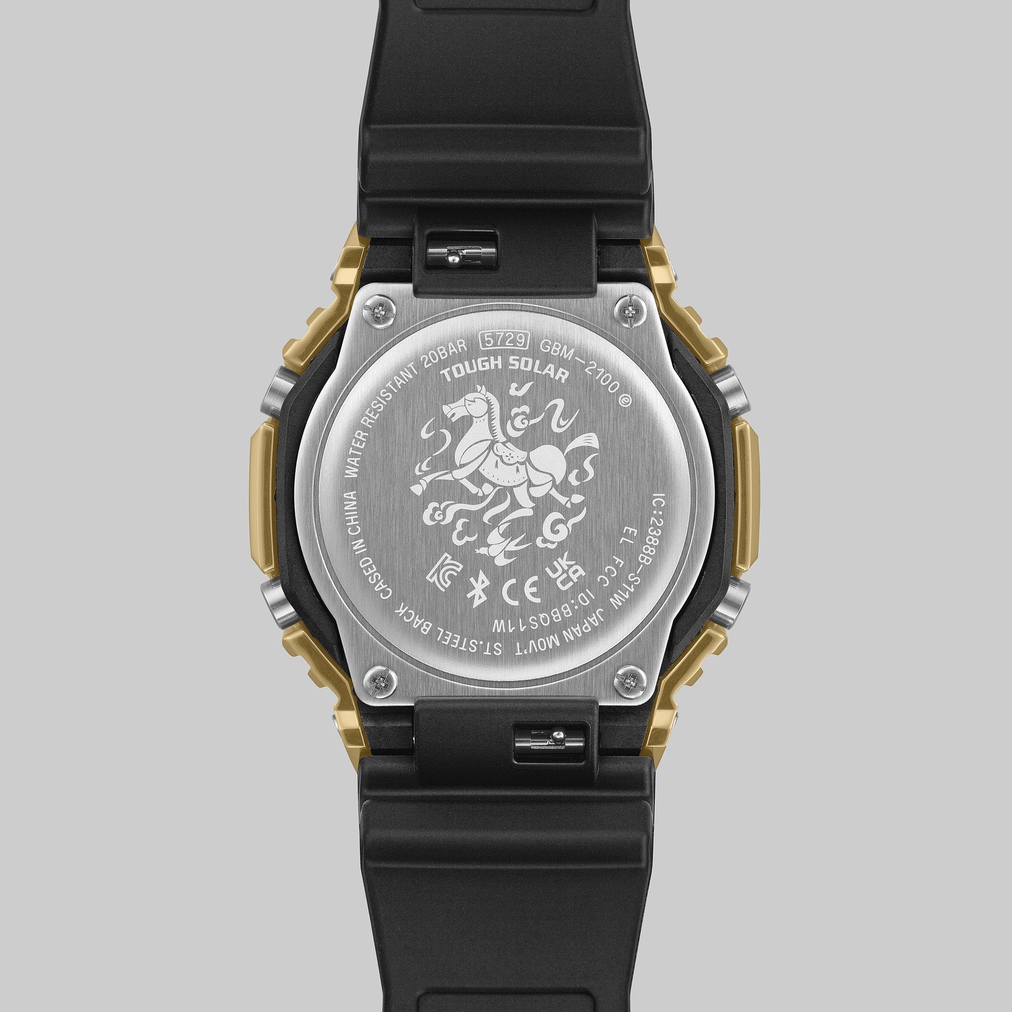 Welcome 2026 with style. Celebrate the year of the horse with a very special G-SHOCK inspired by that powerful symbol of strength and beauty — the mythical “thousand-li” winged horse that can gallop 500 kilometers, or 1,000 li, in a day. A fearless, heroic horse sweeps across the dial, the engraving of the mane flowing out onto a gorgeous gold-colored ion-plated bezel. The result is an extraordinarily dynamic, dimensional design. Gold-colored indexes symbolize the auspiciousness and splendor of the New Year, tipped with bold red that evokes the rugged strength of the thousand-li horse. Illustrations of the mythical equine on the case back and featured on the special packaging complete this classy celebration of the year of the horse. The GBM-2100 comes equipped with Smartphone Link and Tough Solar charging, all while retaining the slim profile for which the 2100 line is known. Welcome in the New Year with a rugged beauty of a timepiece that delivers both toughness and aesthetics.