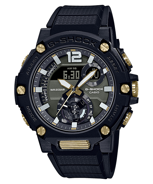This Outlet store product may not have original packaging or may be missing a manual. The product itself is in new condition. Introducing the GSTB300B-1A, the latest in the new rugged style of G-STEEL models that feature Carbon Core Guard structure. The new GSTB300s adopt tough G-SHOCK styling with a disk indicator at 6 o’clock that shows the current mode and charge level, and a front button that completes the overall rugged look. The disk, a round graphic digital display between 1 and 2 o'clock, and a digital display as 12 o'clock add to both functionality and looks. The new GSTB300B-1A model comes in a black case and resin band accompanied with striking Gold IP accented button, screws and buckle.