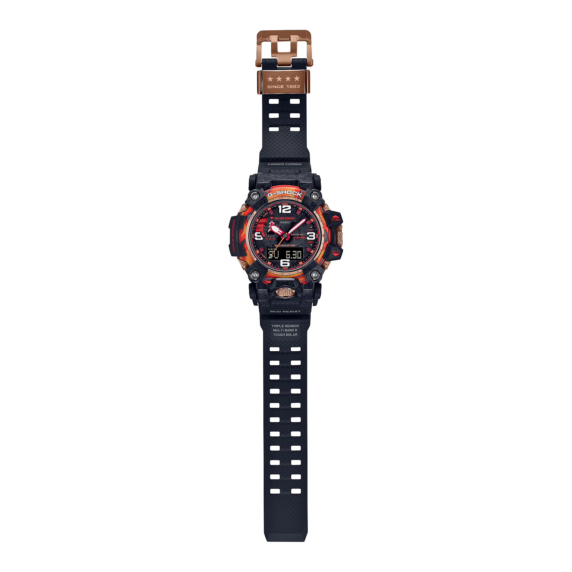 Introducing the G-SHOCK 40th Anniversary Flare Red — an eruption of fiery color in two limited-edition timepieces celebrating the 40th anniversary of the 1983 G-SHOCK debut. Inspired by the intense power of the solar flare, the MTG-B3000 and GWG-2000 both radiate G-SHOCK brand black and red, delivering the best new technologies from Casio. A multicolor carbon-insert bezel, crafted of layers of carbon and glass fiber sheets containing phosphorescent particles, evokes the massive explosive power of the sun’s surface, yielding a timepiece that radiates with glow-in-the-dark beauty. Individually and uniquely patterned bezel components — no two alike — result in truly one-of-a-kind lightweight watches of rugged strength. Take it even higher with the GWG-2000 bezel components, made of forged carbon fiber with phosphorescent particles to match the bezel with solar flare patterns that glow in the dark. Both models feature a solar flare pattern printed on the dial, as well as an Eric Haze-designed logo commemorating the 40th anniversary of G-SHOCK engraved on the case back and four stars for 40 engraved on the band loop. These meticulously beautiful, uniquely impactful timepieces are just right for kicking off the G-SHOCK 40th anniversary celebration.