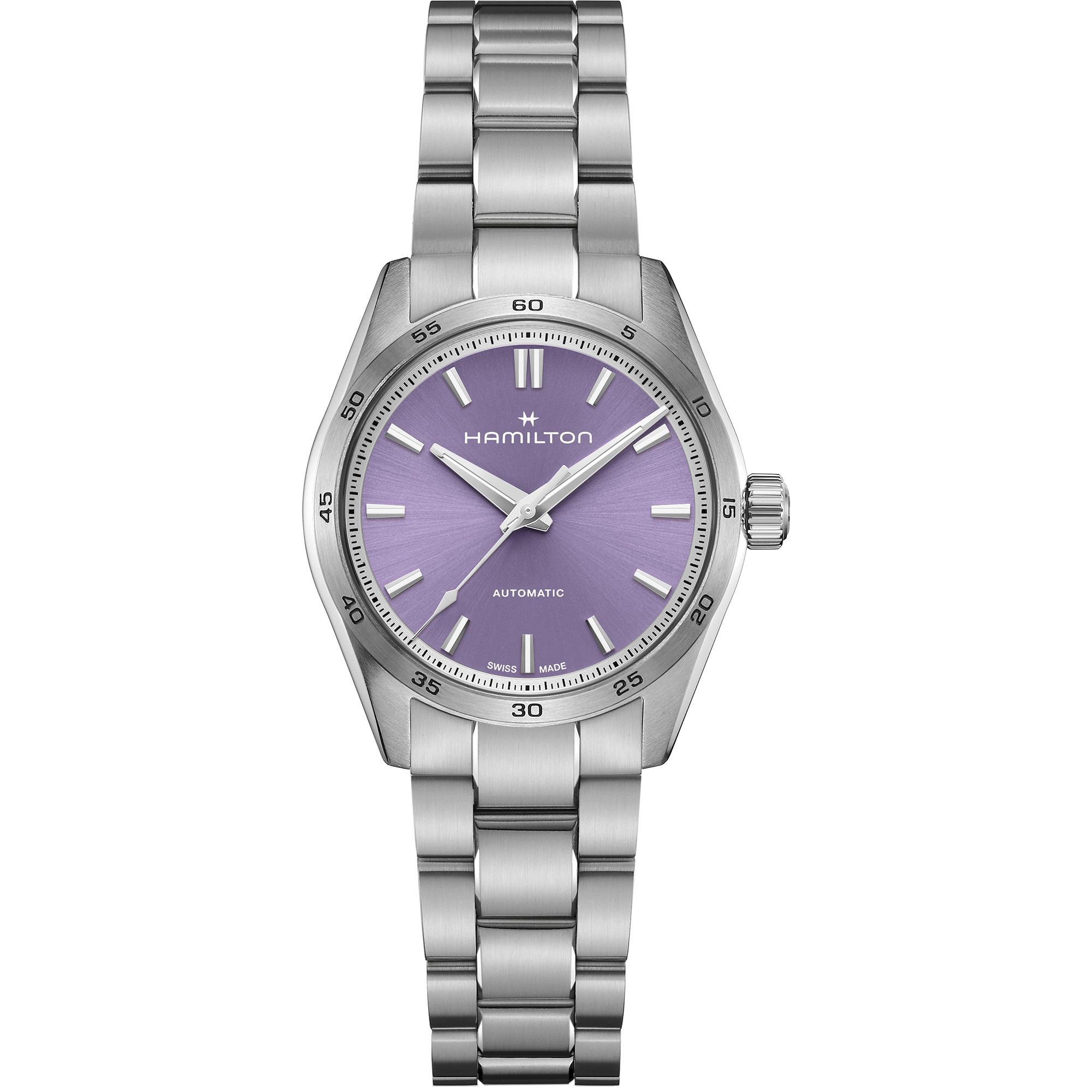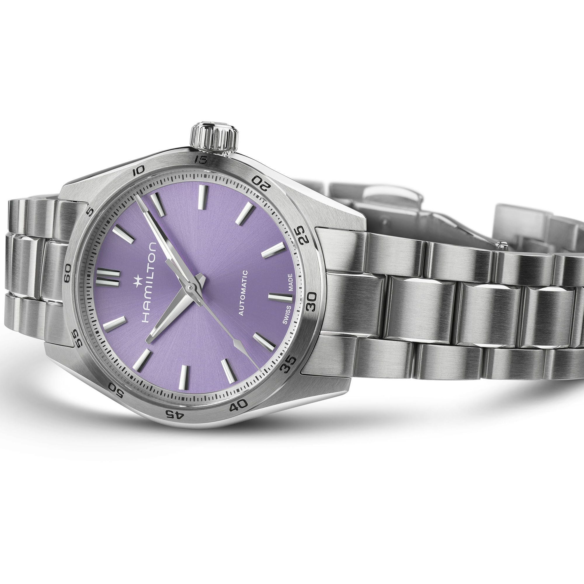 Designed for those who value both performance and style, the Hamilton Jazzmaster Performer Automatic 34mm (H36105170) delivers a refined sport-chic aesthetic. Powered by the H-10 automatic movement with an impressive 80-hour power reserve, this model features a sleek 34mm stainless steel case paired with a cool lavender dial, nickel indexes and a polished stainless steel bracelet. A perfect blend of elegance and versatility for everyday wear.