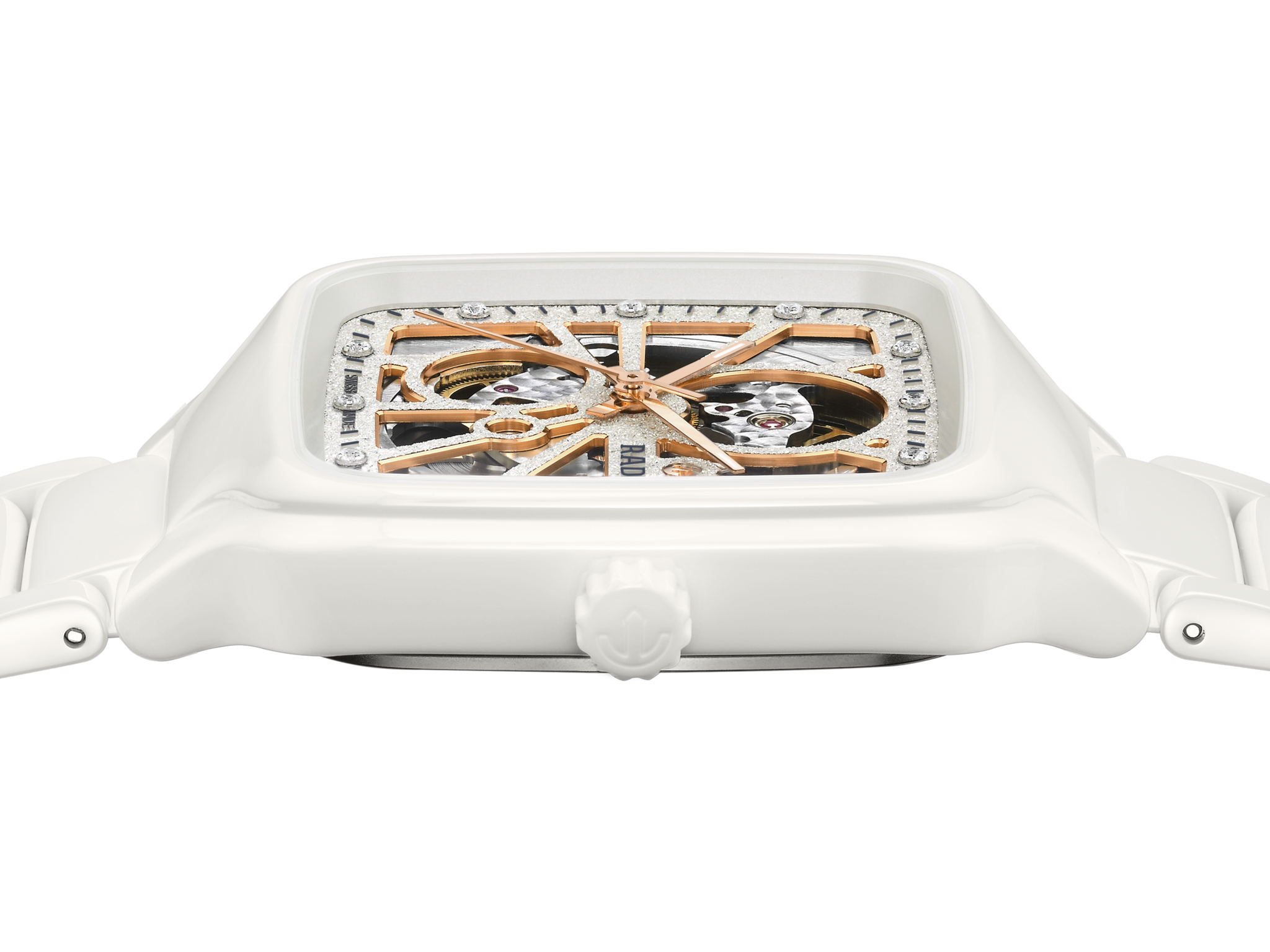 Top-class diamonds and a sparkling dial give the Rado True Square Open Heart (R27073722) a dazzling and elegant presence. Its iconic square case and bracelet are crafted in polished white high-tech ceramic, framing an innovative dial with a rhodium-coloured, diamond-powder-like finish. The unique electro-forming process allows the Rado logo, markings, and minute tracks to rise in sharp relief from the dial’s base, creating a luxurious sparkle complemented by 12 jubilé diamond indexes.
