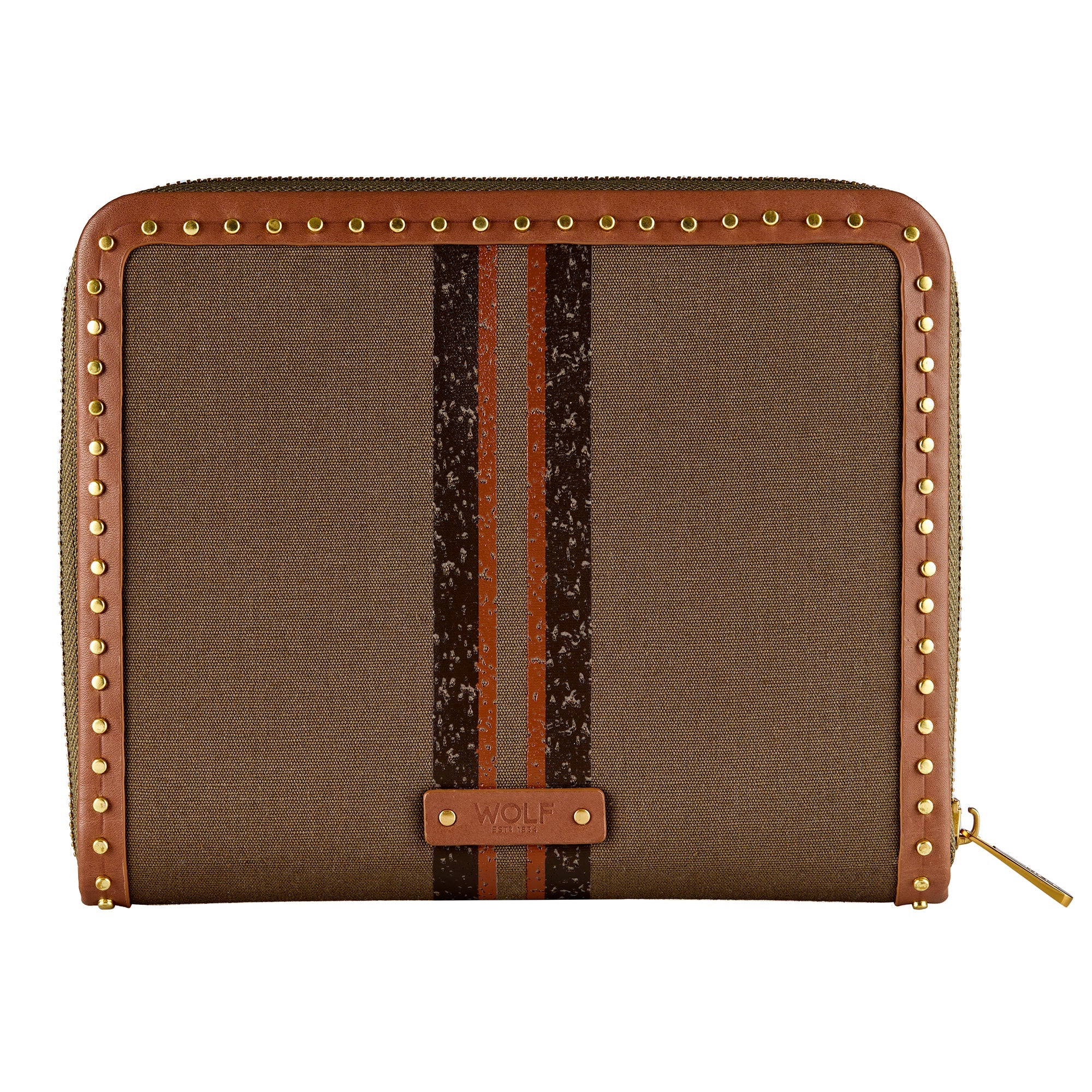 The Ida Travel Zip Jewellery Portfolio features a canvas exterior made from recycled materials in luxurious tones with leather trim. Discover brass stud detailing and zip closure, inspired by Ida’s travel trunk. Inside find the LusterLoc™ treated Ultrasuede lining across multiple jewellery storage compartments. Find earring, necklace, bracelet and ring storage plus 2 zipped compartments. Perfect for all your favourite jewellery pieces when you’re on your travels.